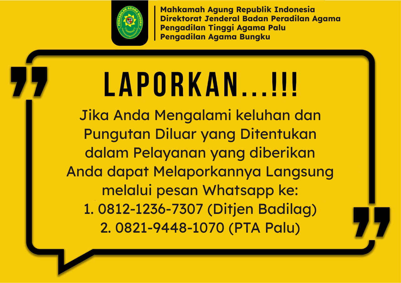 SELAMAT DATANG DI WEBSITE RESMI PENGADILAN AGAMA BUNGKU KELAS II || Anda memasuki Kawasan Zona Integritas menuju Wilayah Bebas Korupsi dan Wilayah Birokrasi Bersih dan Melayani || Harap ikuti Protokol Kesehatan JAGA JARAK dan PAKAI MASKER dengan Benar || Patuhi Tata Tertib yang berlaku saat berada di Pengadilan Agama Bungku || Terimakasih atas Perhatiannya || Contact Person : 085240993139 (Whatsapp)